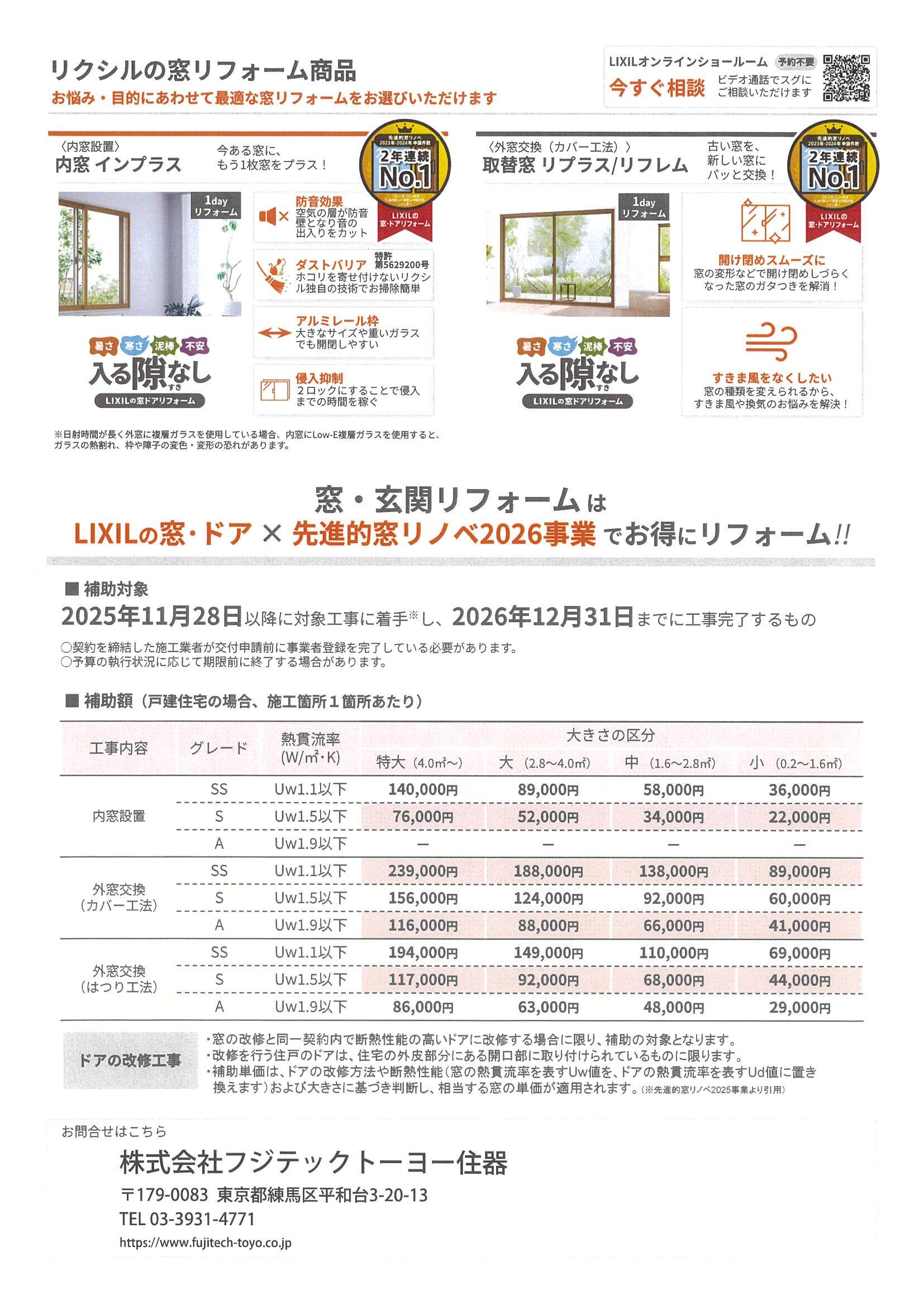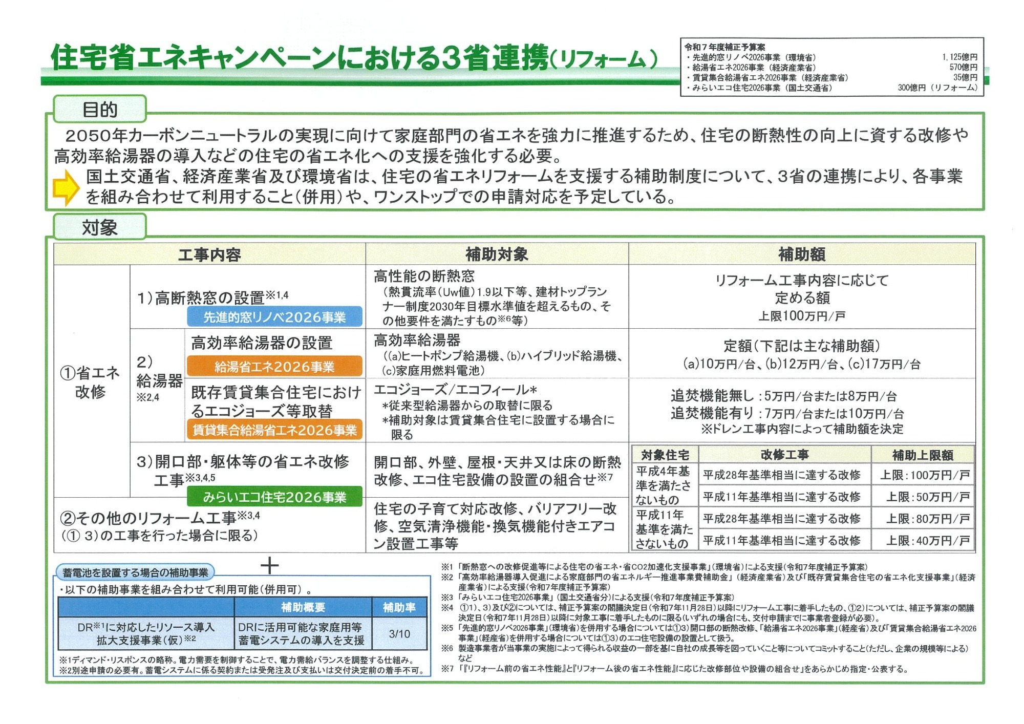 11/28(金)に『住宅省エネ2026キャンペーン』が閣議決定されました。令和7年11月28日(金)以降に対象工事に着手したものを対象とする見込みです。随時情報が入り次第、掲載致します。